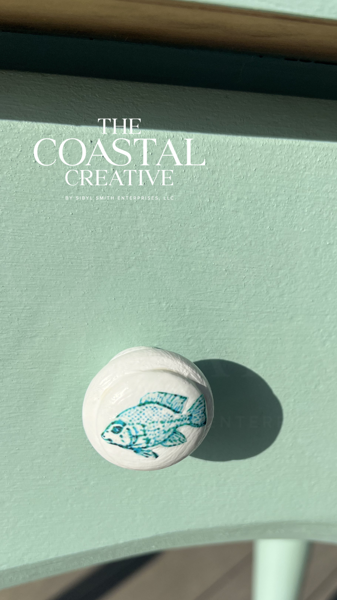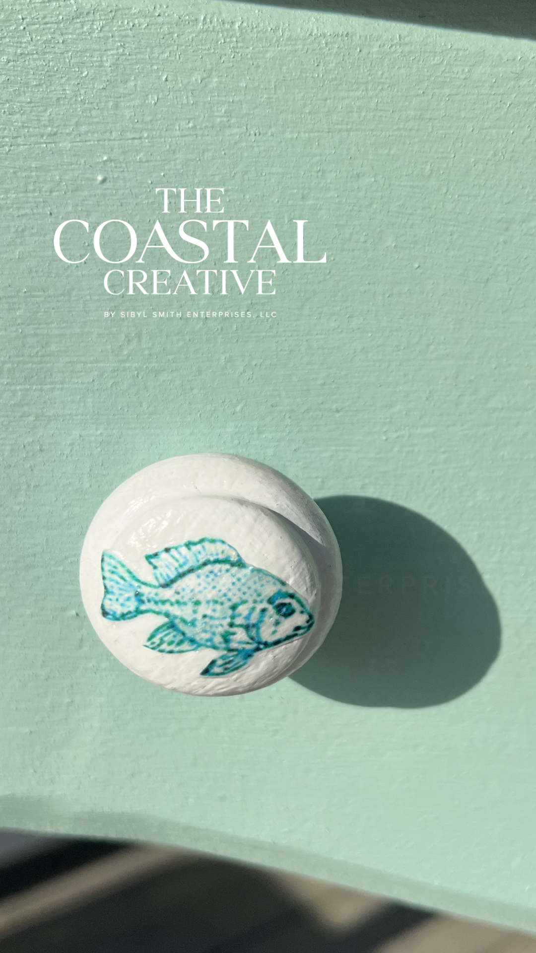 The drawer knobs are one of my favorite details. I decoupaged fish onto simple round knobs to tie in the coastal theme, and they are just the sweetest little things.
