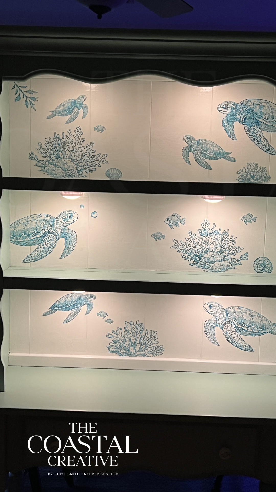 Then I printed my original sea turtle and coral design onto Japanese rice paper, enlarged to fill each shelf section, and decoupaged it directly onto the painted surface using Mod Podge.